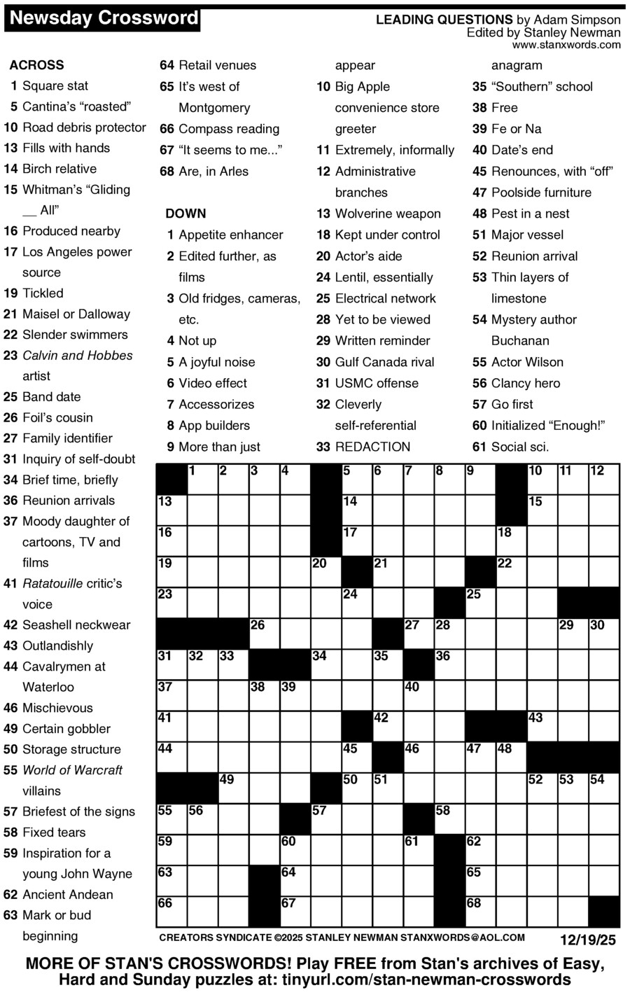 Stan Newman crafts a fresh and challenging puzzle every day of the week! Stay sharp and challenge yourself to solve each and every one.